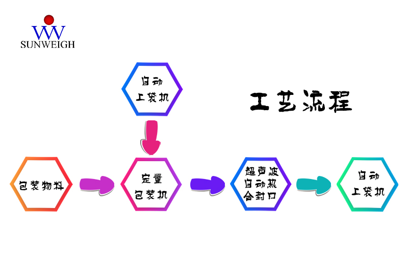 生產(chǎn)出的物料首先進入緩存料倉中,待包裝機開始包裝時,當重量達到事先設定好的值時,包裝機停止給料。自動上袋機自動拾取包裝袋,通過上袋機將包裝袋套在包裝機下料口處,包裝機檢測到包裝袋,螺旋開始工作將物料送入包裝袋內(nèi),等到填袋完畢后,夾袋裝置松袋推袋裝置將裝滿物料的袋子推到輸送機上超聲波封口,最后再由輸送機將包裝好的物料包裝袋輸送到下個工序。